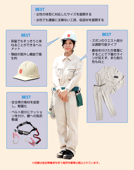 ◆男性用の作業着や靴を女性が使用すると、動きづらさを感じたり、下着のラインが見えてしまったりします。
