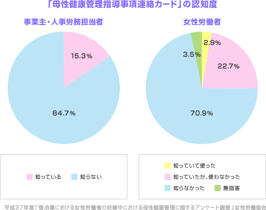 事業主・人事労務担当者、女性労働者それぞれに「母性健康管理指導事項連絡カード(以下、母健連絡カード)」 を知っているか聞きました。 事業主・人事労務担当者は「知らなかった」という回答が84.7%と8割を超える高い割合を占めています。 また、女性労働者でも、「知らなかった」という回答が70.9%となっています。