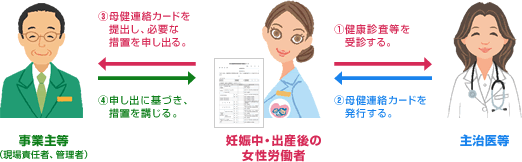 医師等から女性労働者が受けた指導事項を的確に事業主に伝達するためのツールです。 女性労働者は、自分の体調について、主治医等と相談しながら、適切な健康管理を行っていくことが大切です。 主治医等に指導を受けたら母健連絡カードを発行してもらい、事業主に申し出ましょう。 申し出を受けた事業主は、指導事項に従って措置を講じてください。